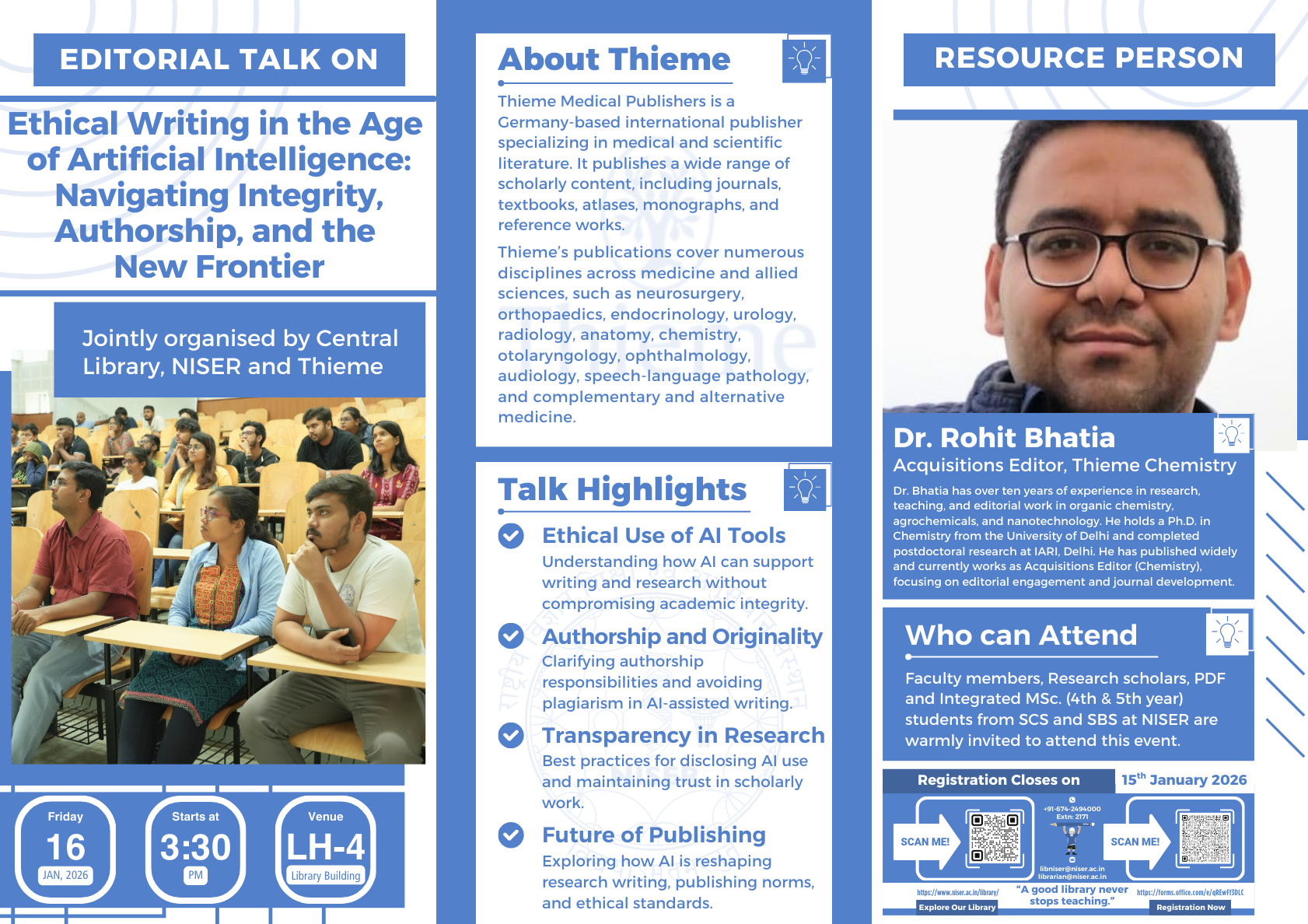 Central Library, NISER & Thieme jointly organizes a Editorial Talk on "Ethical Writing in the Age of Artificial Intelligence: Navigating Integrity, Authorship, and the New Frontier" on 16th January 2026 (Friday).